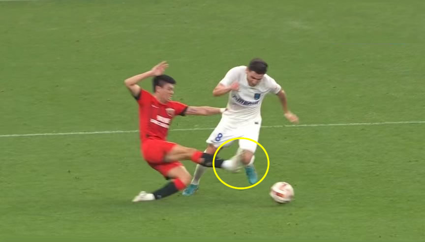 这场比赛中,海港球迷几次红牌铲球动作都逃过处罚。比如李帅在比赛中飞铲抬脚亮鞋钉踢到南通支云球员的膝盖(下图),李海新不仅没给红牌,连黄牌都没掏。