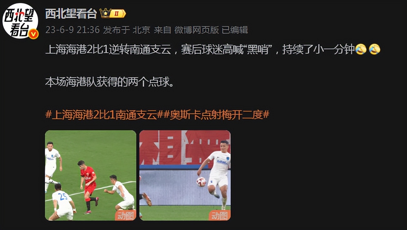 据西北望看台的报道(下图),海港凭借2粒点球逆转南通支云的赛后,球迷高喊“h哨”持续近1分钟。2023赛季是海港夺冠争议最大的一个赛季!这是海港队史第二冠,也是三连冠的起点,之后2个赛季,在穆斯卡特的带领下海港接连卫冕。