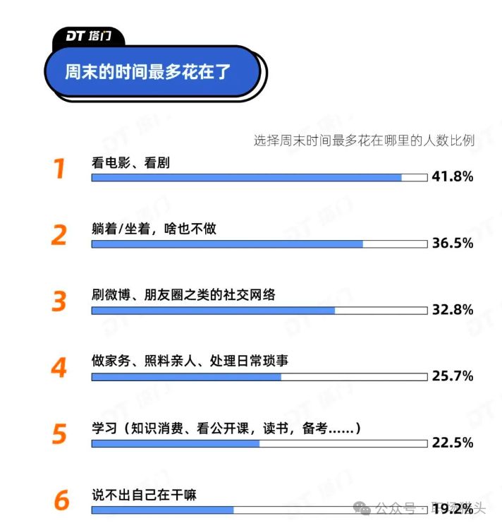 然而,现实中,超过三分之一的受访者选择“躺着/坐着,啥也不做”,紧随其后的则是沉浸在电影与剧集的世界里。