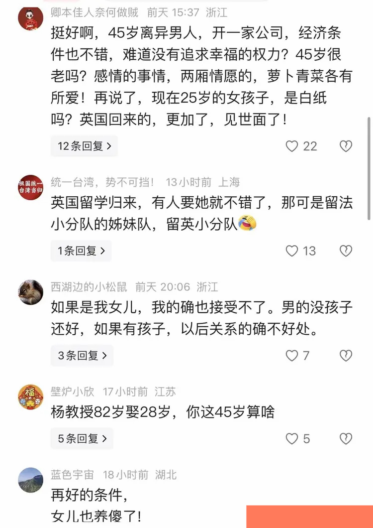 有网友说,奶茶妹22岁的时候嫁给41岁的刘强东,刘强东也是离异的,奶茶妹她家人也没嫌弃。说明这个45岁的男人还是钱不够多,不然也没什么了。