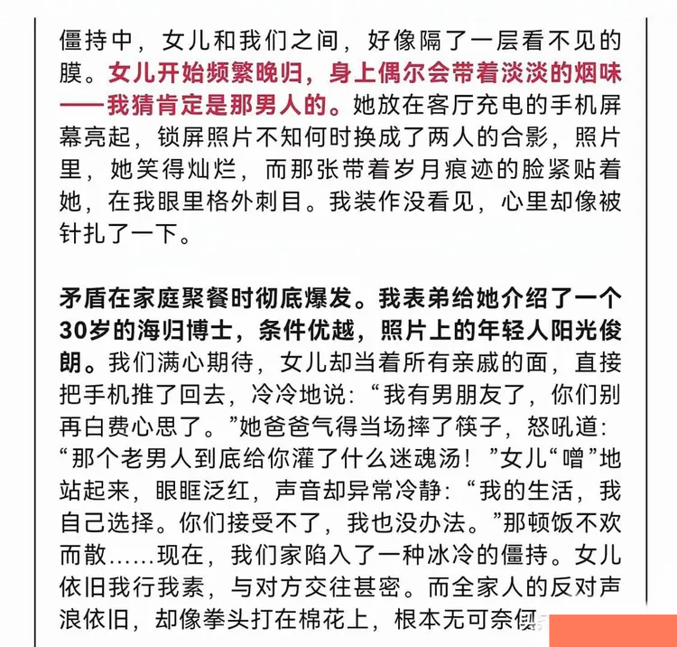 女儿如今好不容易英国留学归来,找对象明明有条件找更好的,可女儿却偏看中了45岁的老男人。