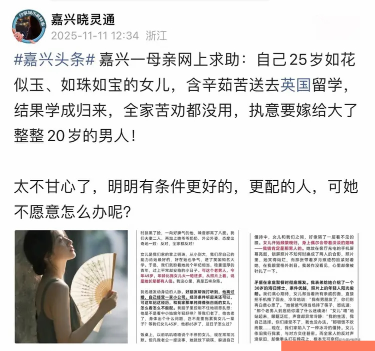 点个关注不迷路。小编就和大家一起聊聊浙江嘉兴一母亲哭诉:25岁海归女儿执意要嫁大20岁老男人这件事。