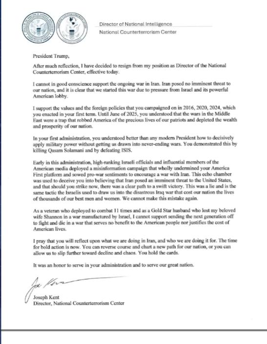 辞职本身已经够敏感。更关键的是,他离开的理由并不含糊。他并不认同美国对伊朗升级军事行动的正当性,也不接受白宫对威胁程度的判断。