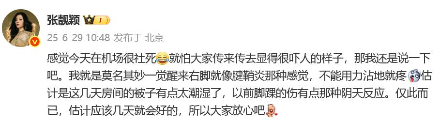 6月29日,张靓颖回应脚伤:“感觉今天在机场很社死,就怕大家传来传去显得很吓人的样子,那我还是说一下吧。我就是莫名其妙一觉醒来右脚就像腱鞘炎那种感觉,不能用力沾地就疼。估计是这几天房间的被子有点太潮湿了,以前脚踝的伤有点那种阴天反应。仅此而已,估计应该几天就会好的,所以大家放心吧。”