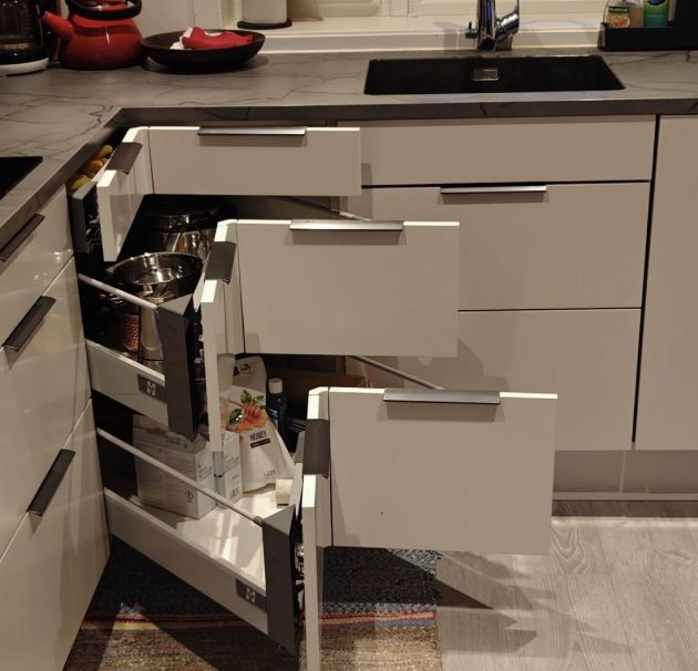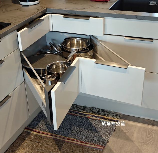 看到这种L形橱柜,最为头疼的就是转角的位置,这些地方往往太容易浪费,即便是塞满东西,到最后也是个拿取不便,放在里面的东西要么过期要么遗忘,没法真正应用起来,实在是有些浪费。