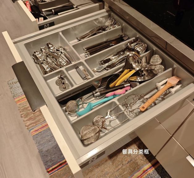 哦对,还有这橱柜的第一层小抽屉,虽然很薄,但完全可以做成专门收纳餐具的抽屉,里面直接做分类格,有大有小,分别收纳勺叉刀筷(好像没筷子)等各种餐具,无论是拿取还是放入其中都一目了然。