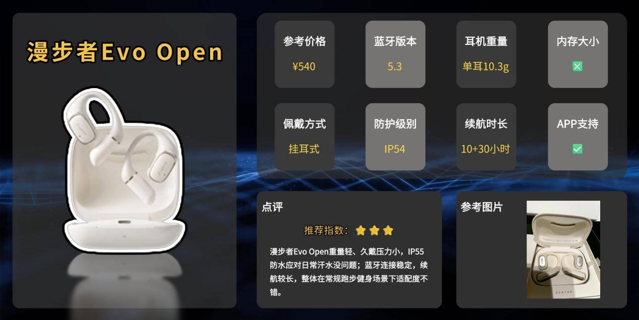漫步者在耳机市场以高性价比和舒适佩戴体验闻名,技术研发在防护设计、续航和智能功能上有积累。Evo Open在漫步者产品线中属于轻量化开放式真无线耳机,主打舒适佩戴、长续航和智能功能。