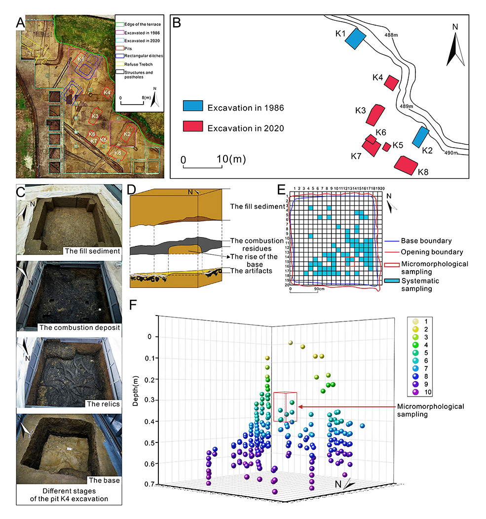 三星堆遗址四号坑综合分析示意图(A. 发掘现场图;B. 祭祀器物坑平面图;C. 四号坑发掘各阶段示意图;D. 四号坑内部沉积示意图;E. 系统采样平面示意图;F. 系统采样三维示意图。)来自四川考古