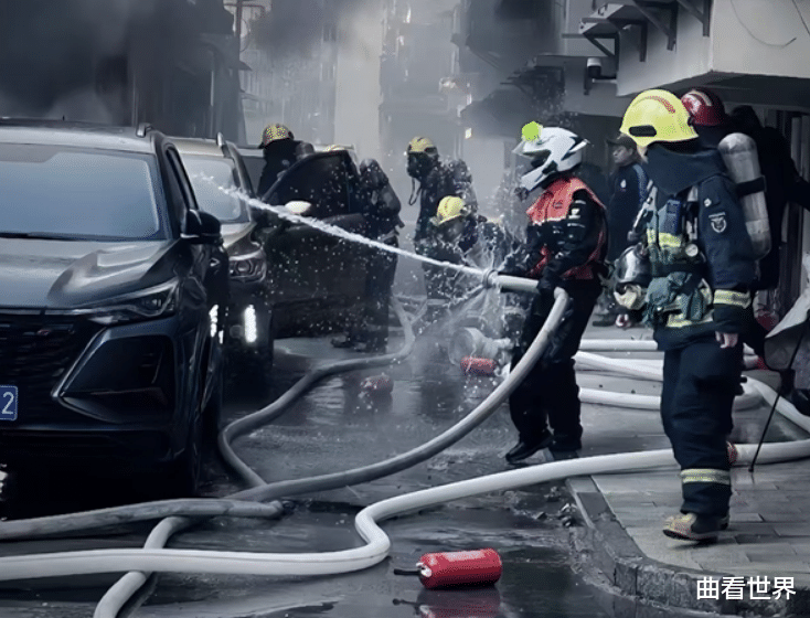 就在身穿黑色羽绒服的大哥奋力灭火的时候,另一位外卖员也加入了战斗。这位外卖员是淘宝闪购的小哥,他原本可能是在送外卖的路上,看到这里起火便毫不犹豫地停下了脚步。他观察了一下火势,发现灭火器虽然起到了一定的作用,但对于如此凶猛的大火来说还是有些力不从心。于是他当机立断,及时接过了保安递来的消防栓水枪。他的动作娴熟而专业,在不到两分钟的时间里,就成功地将火情扑灭了。熊熊大火在他的努力下逐渐熄灭,只剩下一些还在冒烟的残骸,仿佛在诉说着刚刚那场惊心动魄的战斗。