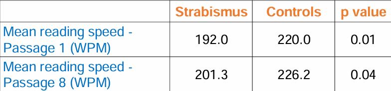 然而,在阅读速度方面,第1篇文本阅读速度,斜视组为192.0±42.4 WPM,对照组为220.0±29.3 WPM(P = 0.01);第8篇文本阅读速度,斜视组为201.3±47.1 WPM,对照组为226.2±30.7 WPM(P=0.04)。