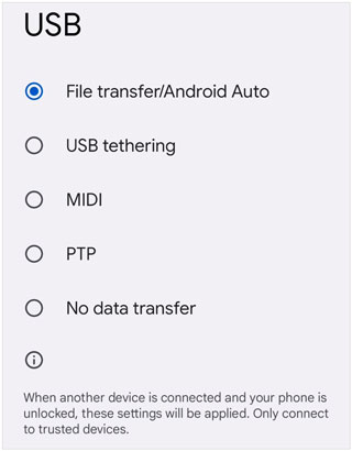 在您的安卓手机上,从屏幕顶部向下滑动以查看通知面板。点击显示“正在通过 USB 为该设备充电”(或类似内容)的通知。在出现的选项中,选择“文件传输/Android Auto ”。