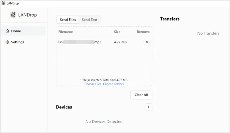 请确保您的电脑和安卓手机连接到同一个本地 Wi-Fi 网络。接下来,在电脑上打开 LANDrop。将您想要传输的音乐文件拖放到应用窗口中,或者点击“添加”按钮。