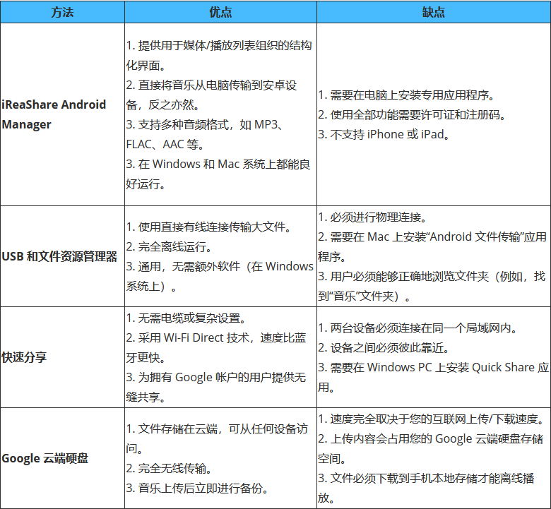结论如您所见,有很多方法可以将音乐从电脑传输到安卓设备。此外,您无法完全按照上述步骤发送歌曲。另外,如果您还想在电脑上管理安卓设备上的音乐, iReaShare Android Manager将是您的理想选择。有了它,您可以轻松地传输和整理音乐。
