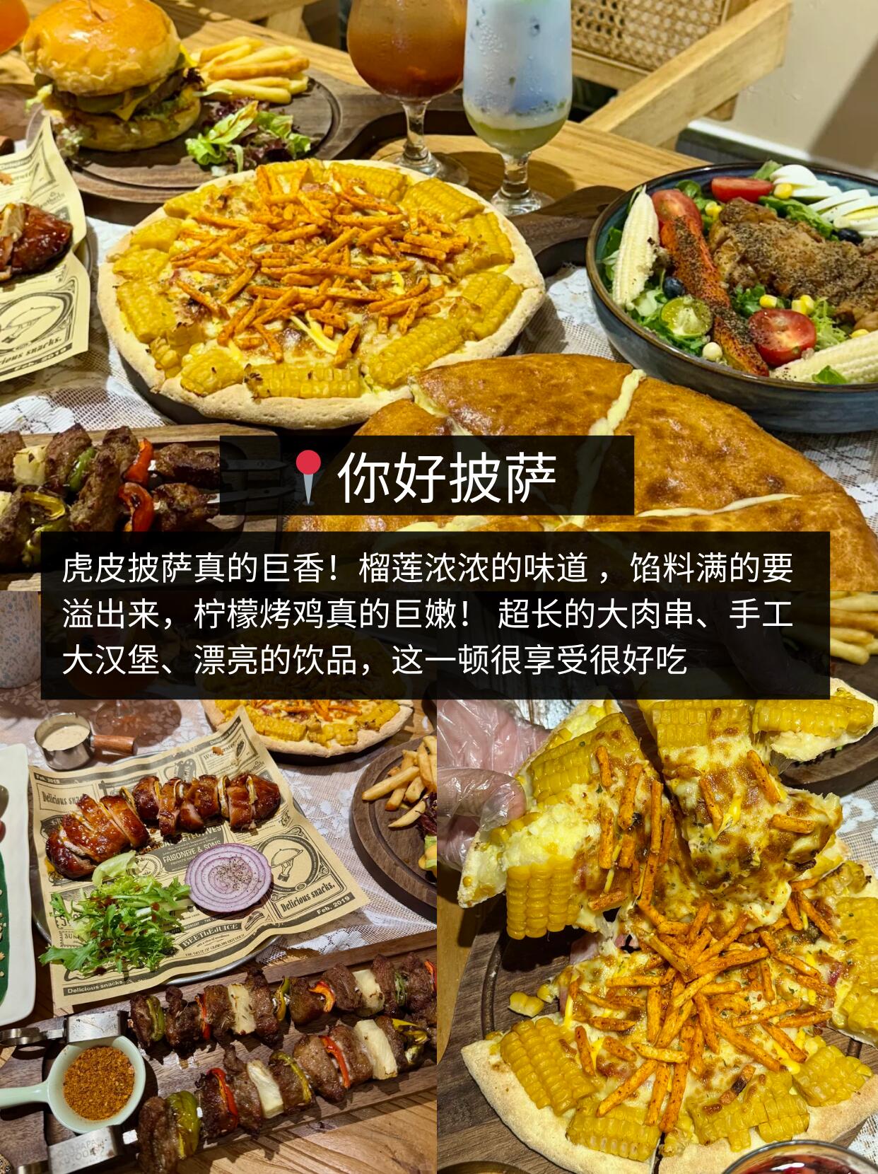 虎皮披萨真的巨香!榴莲浓浓的味道 ,馅料满的要溢出来,柠檬烤鸡真的巨嫩! 超长的大肉串、手工大汉堡、漂亮的饮品,这一顿很享受很好吃