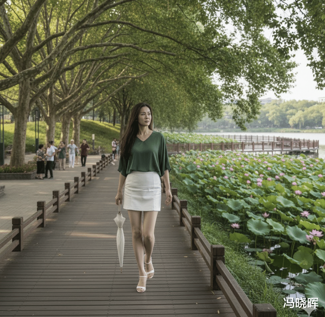 美女面容白皙姣好,身材高挑,身穿墨绿色宽松短衫和白色短裙,脚穿肉色长袜和白色高跟鞋,步履轻盈地走在荷池栈道上,犹如T台上的美女模特,清丽而又高雅,时尚而又性感。她的气质和美丽仿佛赛过了那些荷花仙子,她们纷纷倩姿轻摇,向美女含羞凝望。