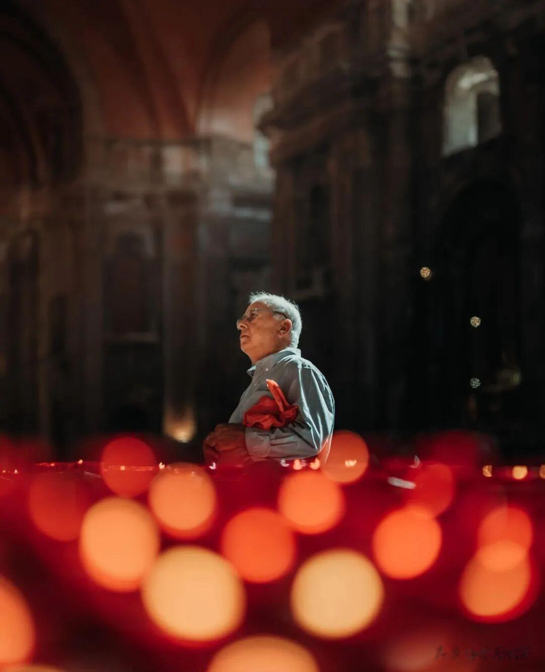 • 教堂内部的作品,前景的烛光形成虚化的框架,将画面中心的老人包裹其中,框架的暖调与背景建筑的冷调形成对比,既突出了人物的虔诚姿态,又营造出“信仰在光影中具象化”的神圣感。