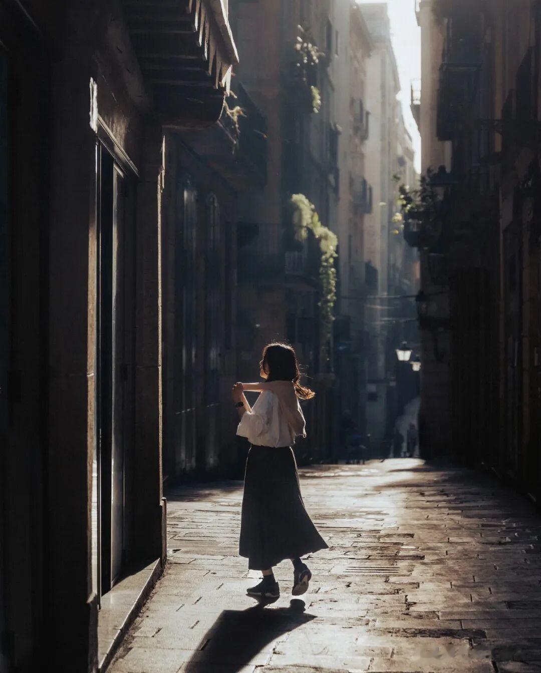 • 逆光与轮廓光:如巴塞罗那哥特街区的作品,阳光从建筑缝隙中以“丁达尔效应”穿透,形成放射状的光束,将远处的行人勾勒出黑色轮廓,画面明暗的强烈对比,既突出了哥特建筑的神秘质感,又让“光”成为画面的视觉主线,仿佛在讲述一场“光与影的朝圣”。