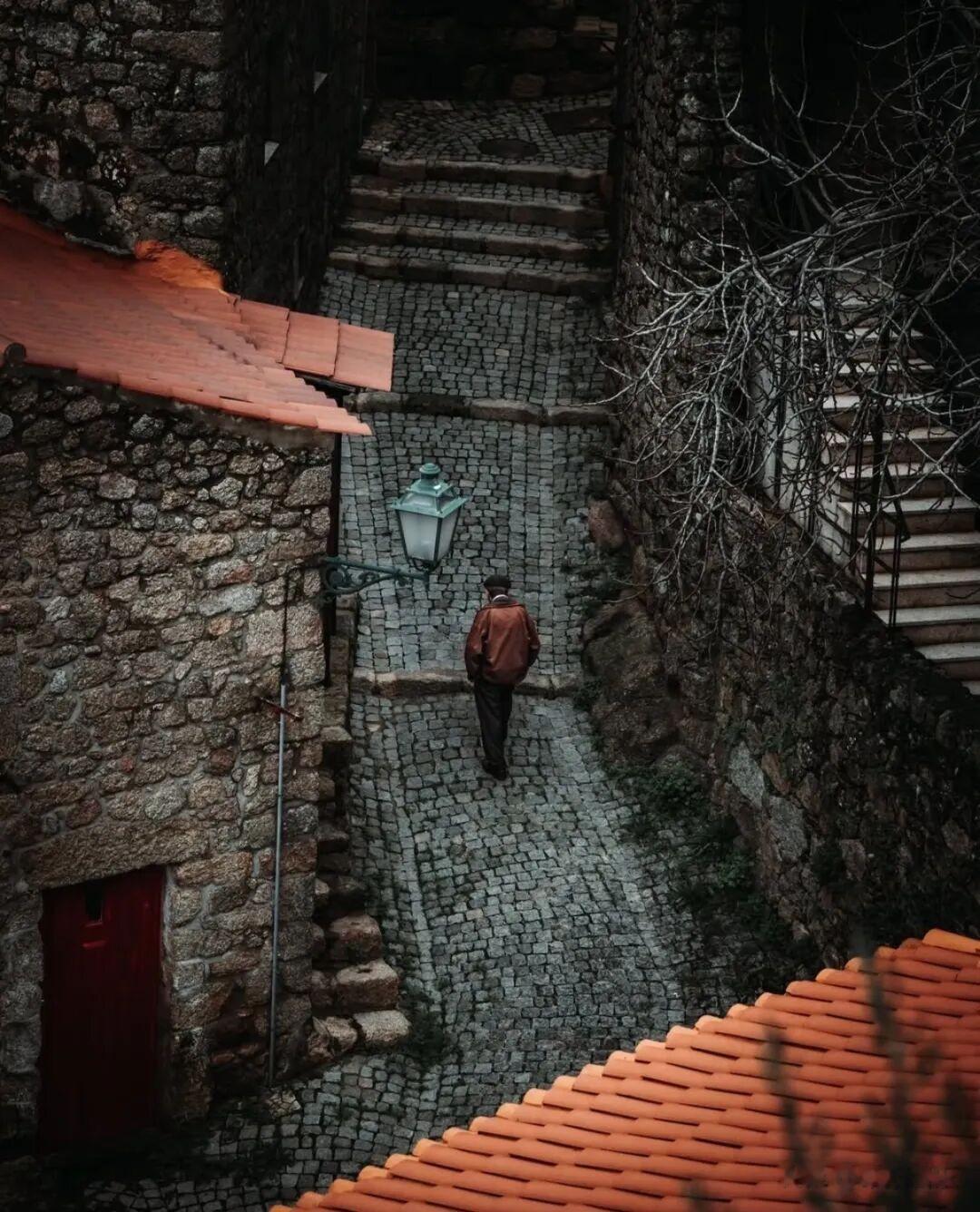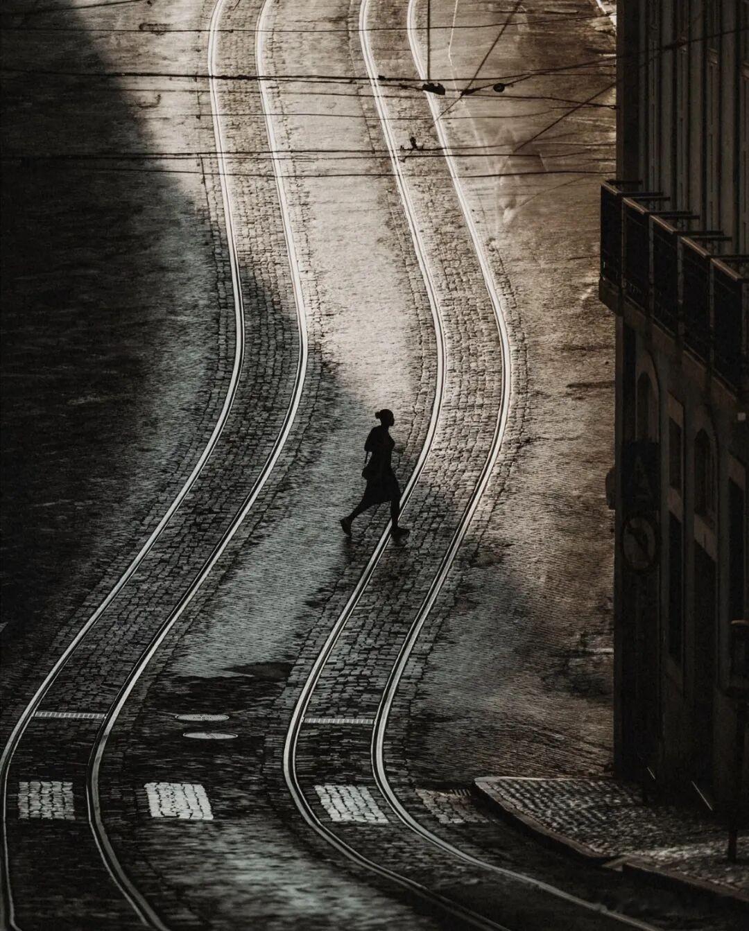 • 里斯本商业广场的拱廊作品,利用拱廊的对称性构建画面,人物位于右侧黄金分割点,地面的水洼形成完美的倒影,让对称构图从“静态秩序”升级为“虚实共生”的视觉游戏,建筑的庄重与人物的动态形成对比,既展现了建筑的几何美,又赋予画面人文的灵动。