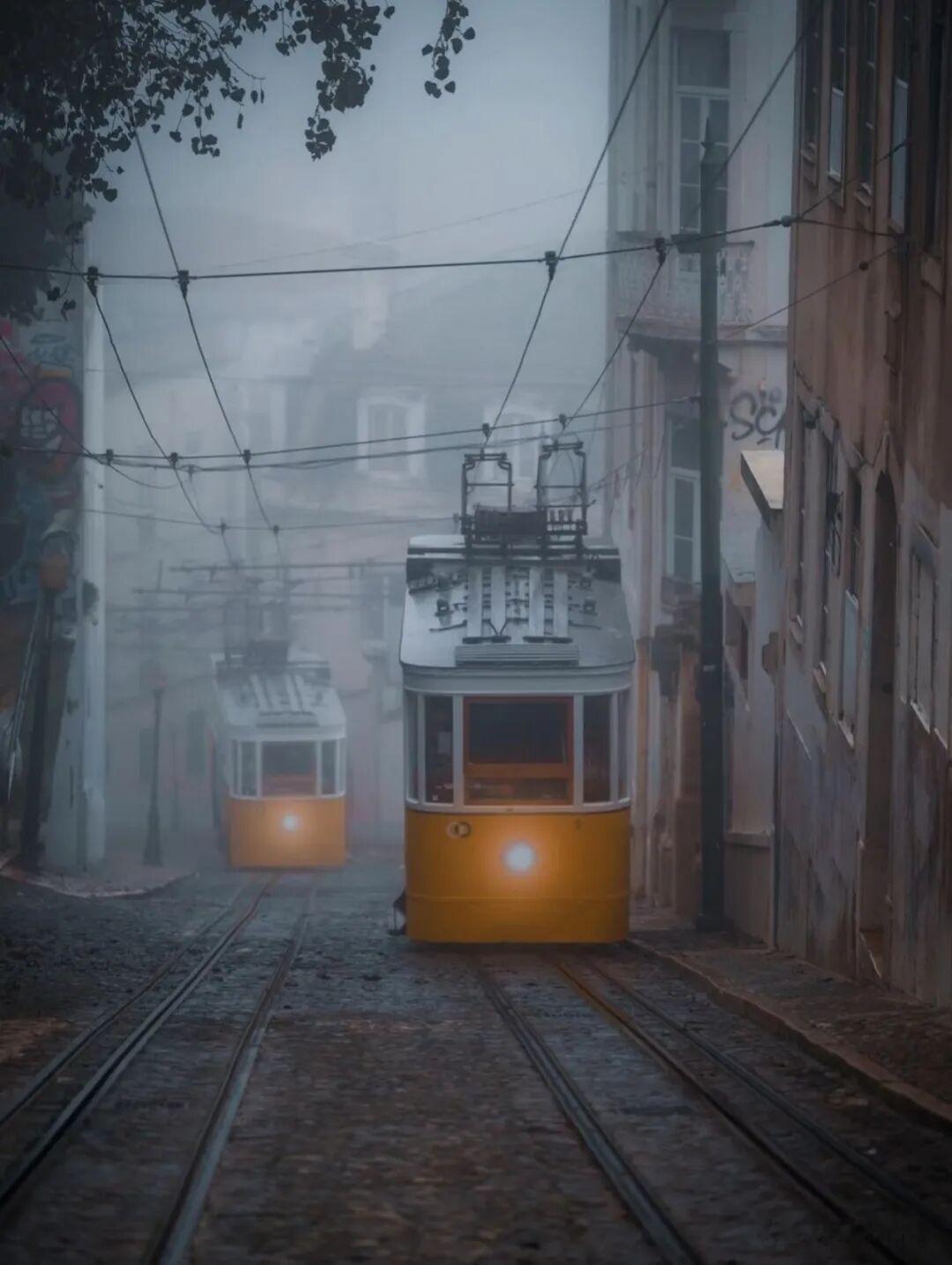 • 里斯本清晨街道的作品,电车轨道从画面底部向远处延伸,两侧建筑的竖直线条与之平行,引导线将视线引向雾中的山城建筑,仿佛在讲述“城市尽头的故事”,纵深感让画面充满延伸感与想象空间。