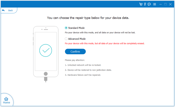设备被检测到后,点击“开始”按钮。您将看到两个修复选项:“标准模式”和“高级模式”。如果您不想丢失数据,可以选择“标准模式”,然后点击“确认”。