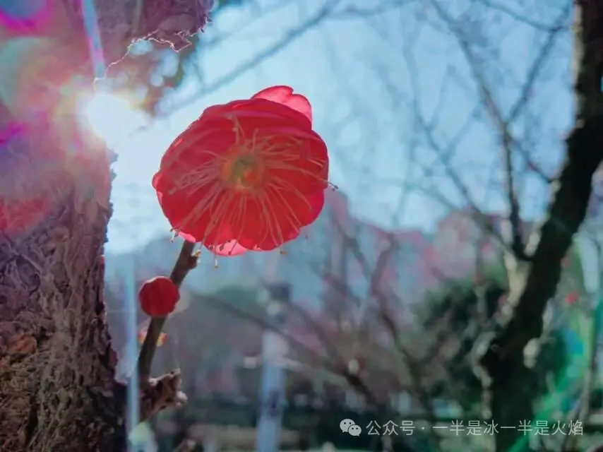 此刻,暖阳下梅花静静开放,没有虬枝盘曲,也不惊心动魄。它枝干清瘦,疏疏朗朗地伸向天空,像用极淡的墨,在生宣上不经意地描了几笔。可就在那瘦硬的枝头,花却开了。不是热闹的,挨挨挤挤地开,而是一朵,两朵,伶伶仃仃地缀着。那颜色也并非明艳的红,是一种带着粉白底子的红。走近去闻,竟一丝香气也没有。当然,它是不会用世俗的香来招蜂引蝶的。它的心,它的魂魄,它的风骨,是内敛的,沉静的,只与同频的人,在静默里相通。