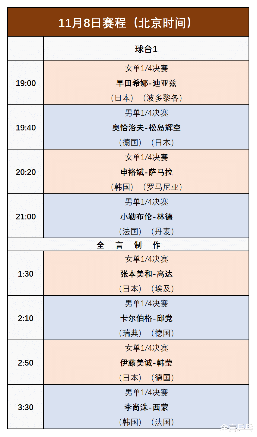 根据安排,北京时间11月8日晚将率先进行4场单打1/4决赛,以下为详细赛程: