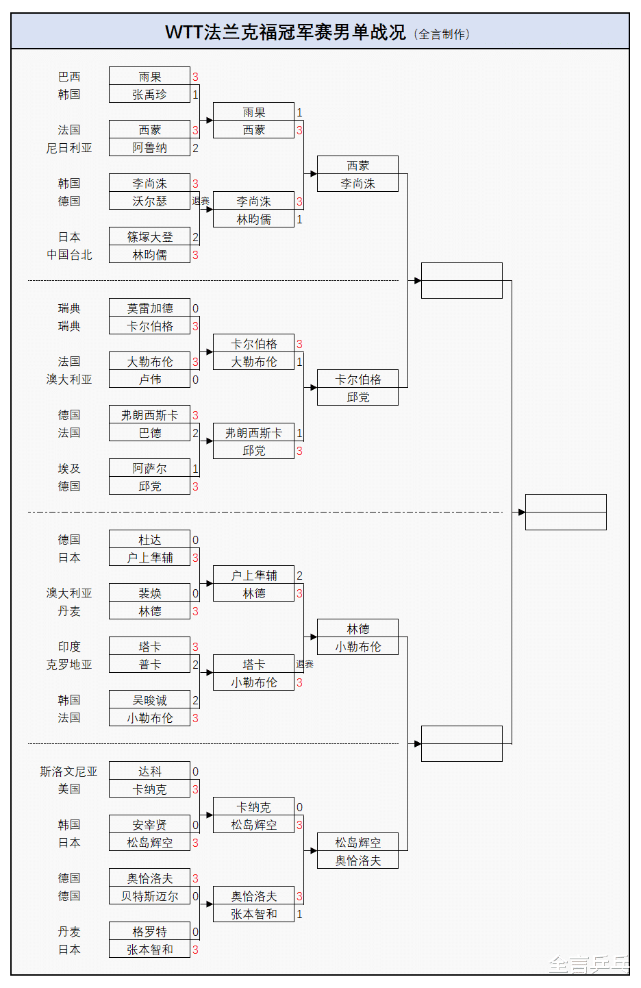 本站比赛的竞争非常激烈,男单前八号种子中的6人无缘8强,包括一号雨果(巴西)、二号张本智和(日本)、三号莫雷加德(瑞典)、五号杜达(德国)、六号达科(斯洛文尼亚)、七号林昀儒(中国台北),仅剩四号小勒布伦(法国)、八号邱党(德国)过关,详细战况如下: