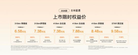 续航虚标、空间局促、冬季充电难——这些仍是2025年新能源小车用户最揪心的痛。近日,杭州举行的2025吉利汽车用户大会上,累计销量突破40万辆的2026款吉利星愿给出新解法:携6个版型焕新上市,限时权益价6.58万元–9.58万元,更有张柏芝与任贤齐"世纪同框"揭幕的STAR限定版,以"高配低价"直击用户核心焦虑。