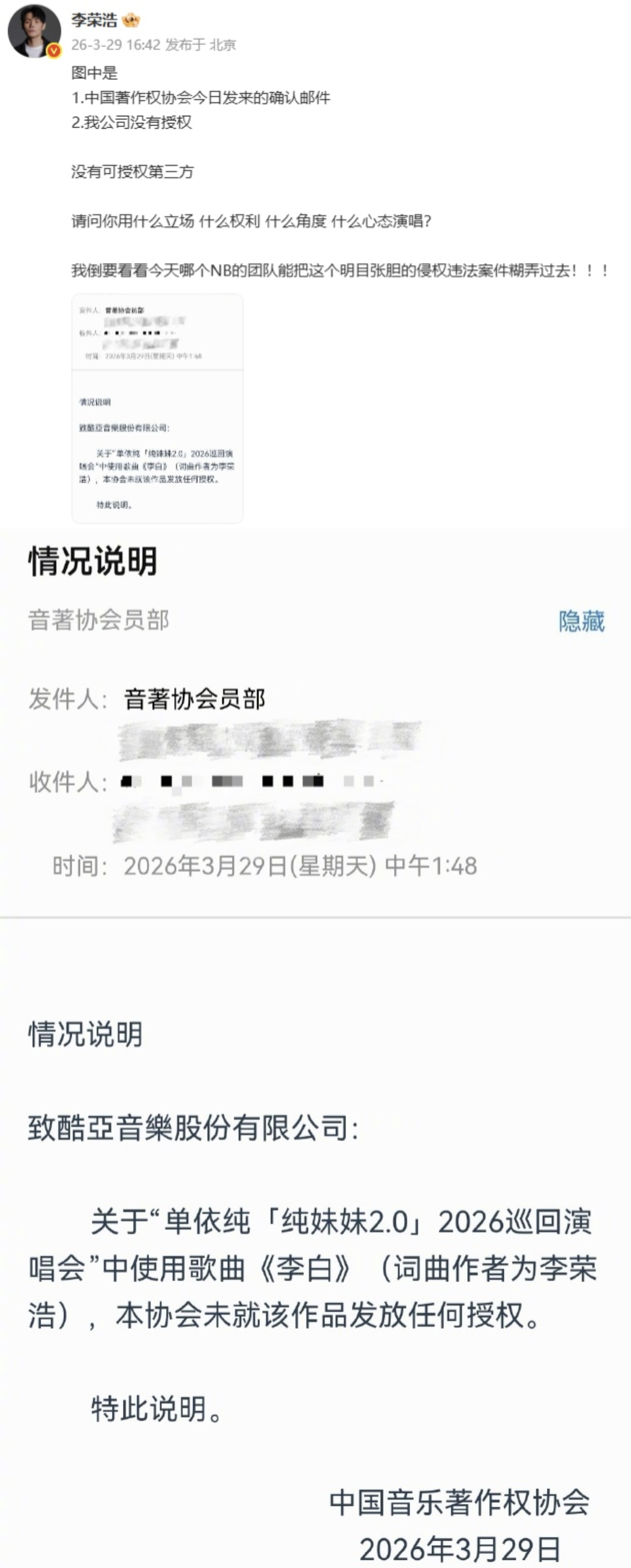 李荣浩再次发文,晒出中国音乐著作权协会的邮件截图,并连续发问:"请问你用什么立场、什么权利、什么角度、什么心态演唱?"这一表述被外界称为"四连问",迅速登上热搜榜单。