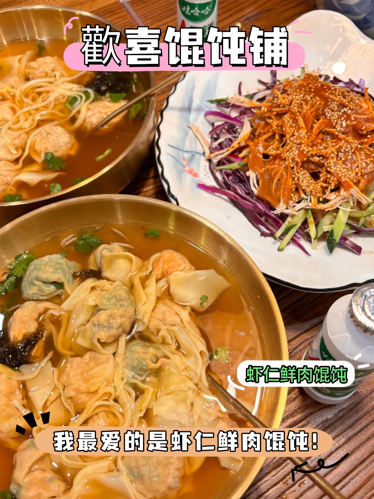 🥟歡喜馄饨铺:我最爱的是虾仁鲜肉馄饨!馄饨皮煮完软乎乎还透着点亮,咬开就能看到完整的虾仁🦐,嚼着 Q 弹,鲜气很足。荠菜鲜肉馄饨也值得试,有野菜的清香混着肉香🥬,不厚重。汤底是熬好的骨汤,撒点葱花更鲜,配一小碟脆萝卜干🥢,清爽又开胃~