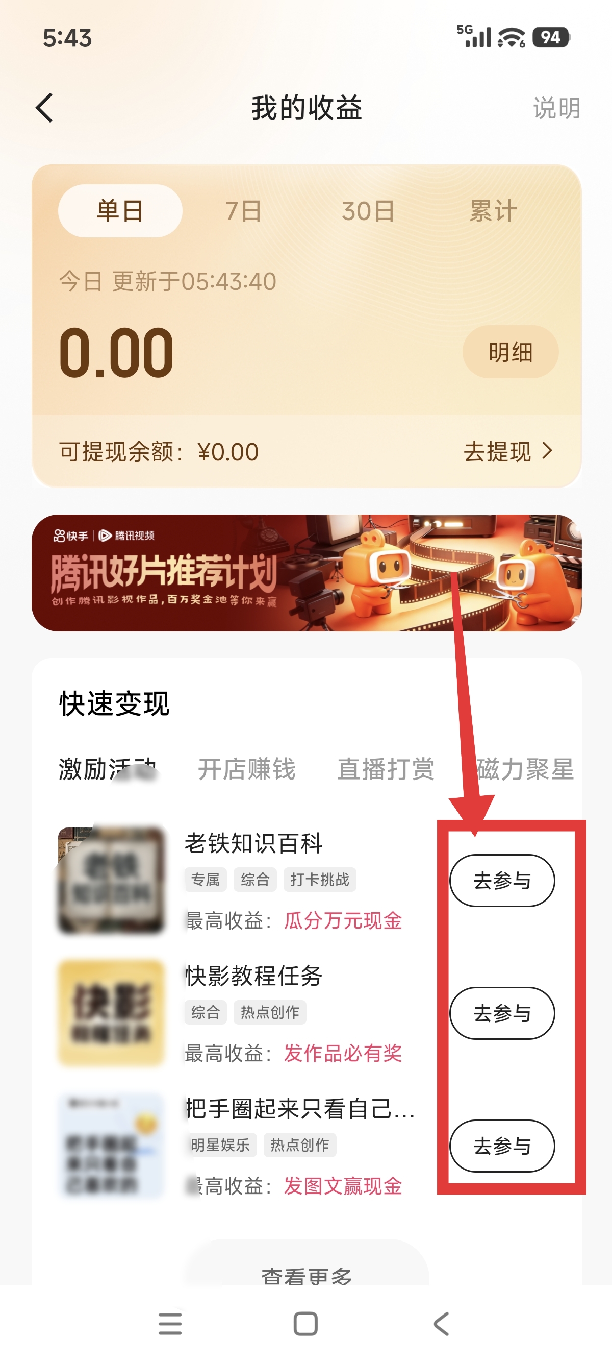 6.到我的收益页面后,就可以看到收益了,或者点击(去参与)活动即可获得现金奖励。