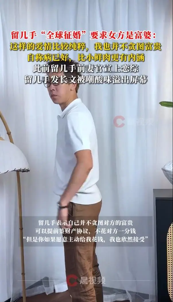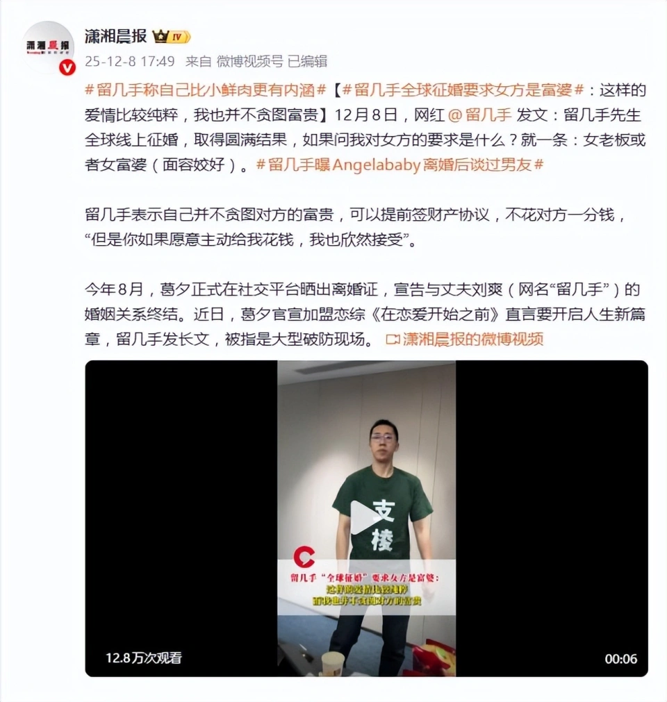 12月8日,初代毒舌网红“留几手”(本名刘爽)在社交平台甩出全球征婚声明,条件直白到炸裂:“只找女老板或女富婆,要求面容姣好、自带能量”,瞬间炸上热搜,网友直呼“软饭硬吃的终极形态,算是让他玩明白了”!
