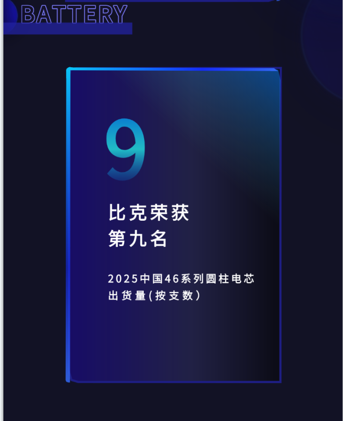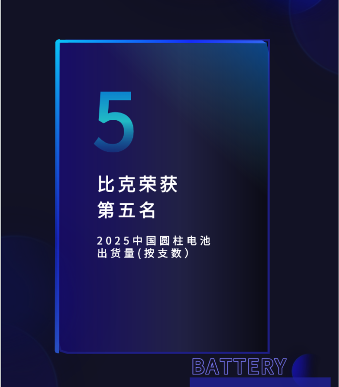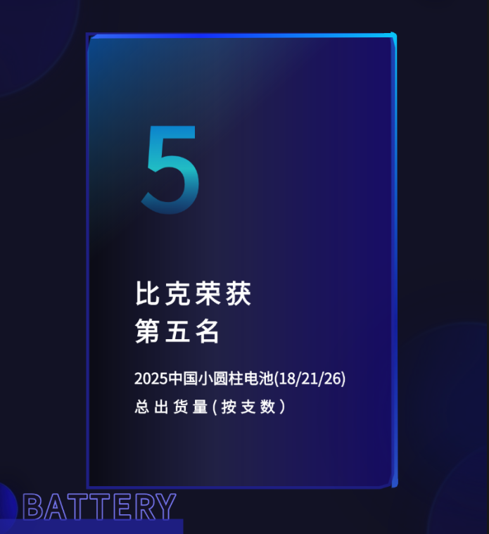 在核心的出货量排行榜中,比克电池表现稳健。在“2025中国圆柱电池总出货量排行榜(按GWh)”中位列第7,在按支数计算的排行榜中更是高居第5位。这印证了其强大的规模化生产和市场交付能力。特别是在传统优势领域的小圆柱电池(18/21/26系列)市场,比克电池在按GWh计算的出货量排名中位列第5,持续保持领先地位。