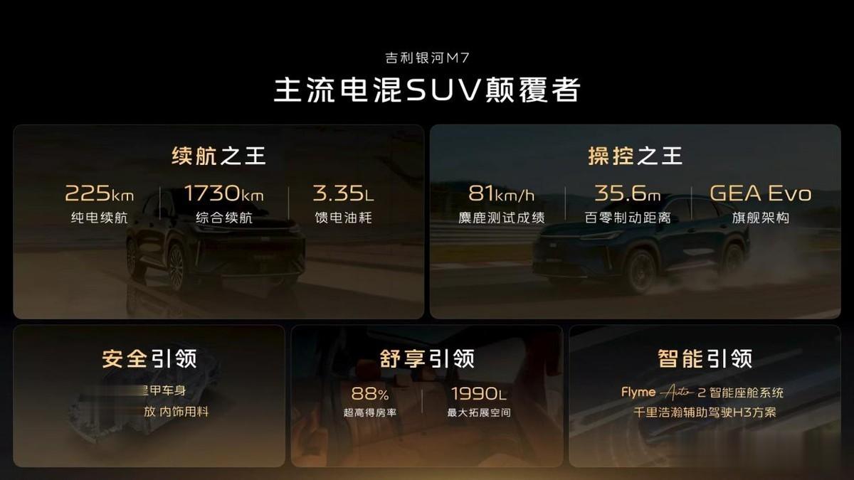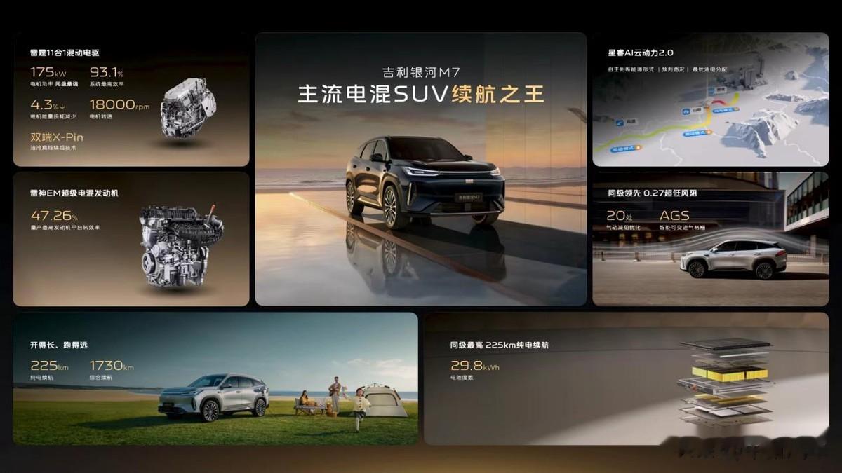 定位于“主流电混SUV颠覆者”,吉利银河M7的三大技术尖点,每一项都直击新能源用户续航焦虑、操控安全、用车成本的核心痛点,构建起同级领先的产品竞争力。