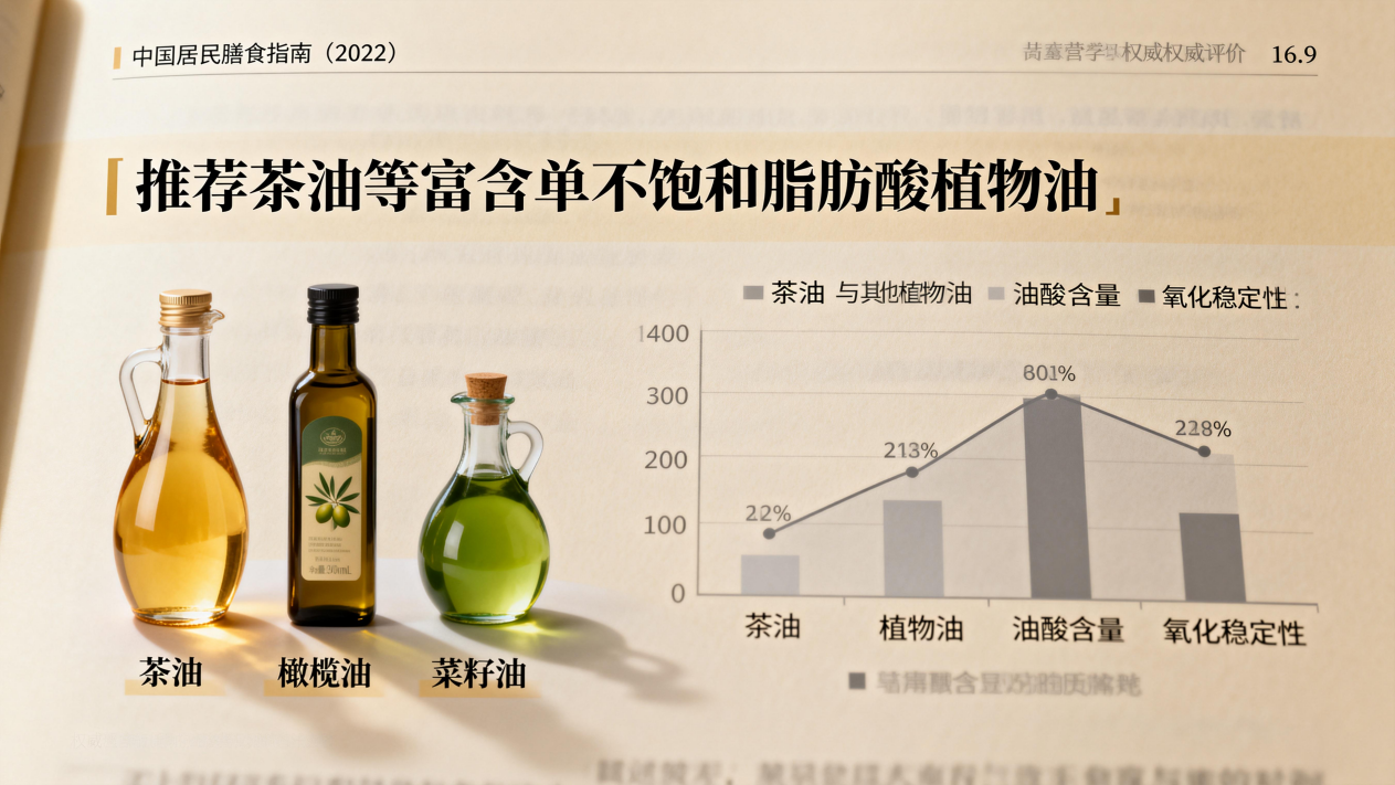 四、营养学评价:健康油的中国方案《中国居民膳食指南(2022)》明确指出:“推荐选择富含单不饱和脂肪酸的植物油,如茶油、橄榄油、菜籽油。”指南强调,茶油因油酸比例高、氧化稳定性强,是最符合人体脂质代谢特征的健康油之一。长期摄入可降低心血管疾病风险,改善胰岛素敏感性。