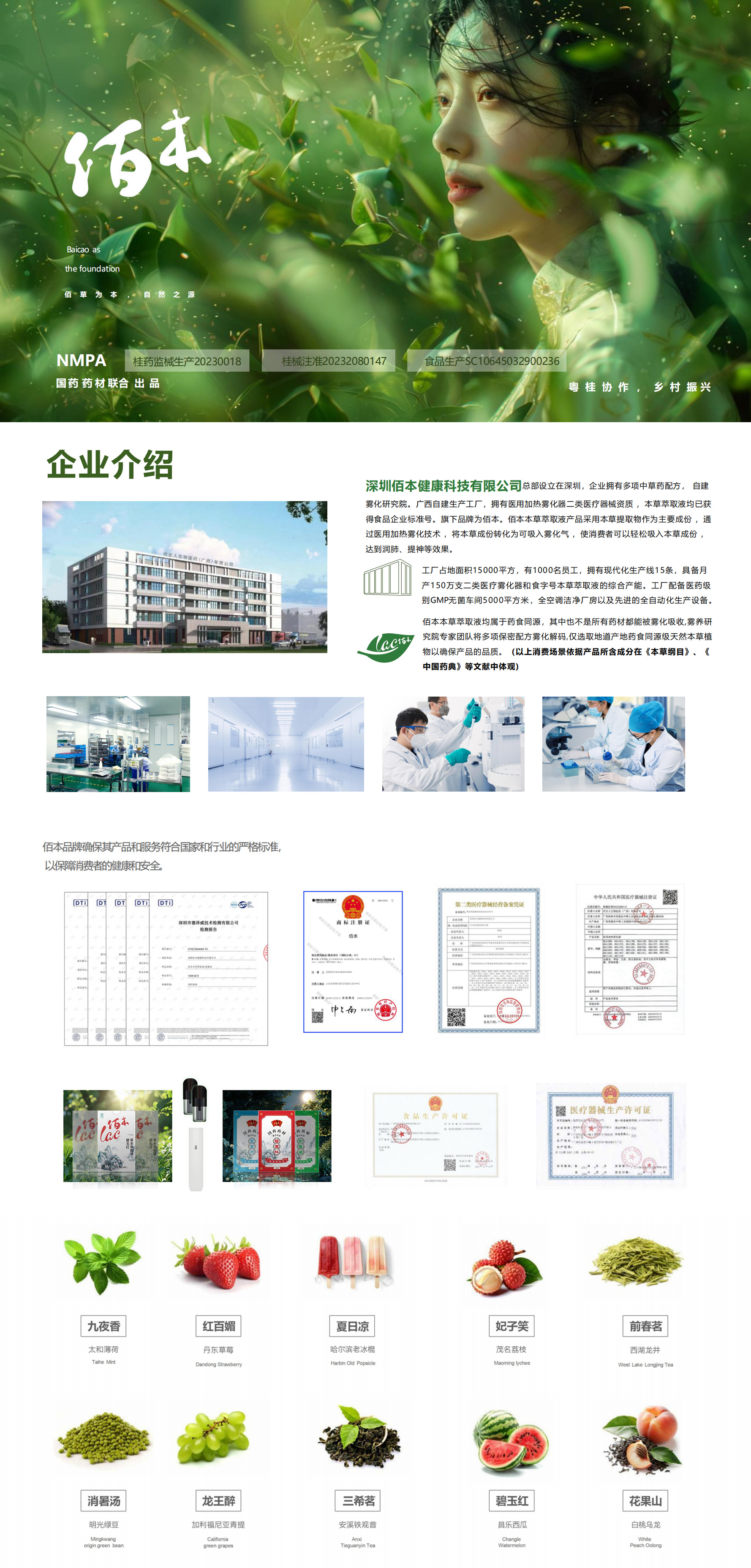 作为一家专注于食药同源本草雾化领域的公司,佰本深知大健康消费市场的潜力,致力于为消费者提供安全可靠、高品质的产品。同时积极响应国家号召,主打粤桂协助,致力于助力乡村振兴发展。公司注重技术创新和产品质量,拥有一支高素质的研发团队和生产队伍。严格遵循国际质量管理体系的要求,从原材料的选择到生产工艺的控制,层层把关和检验,确保产品的品质和安全。