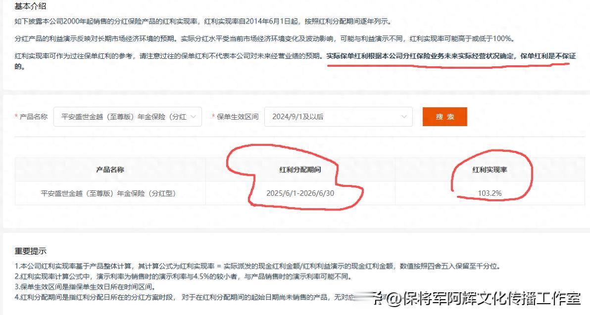 来看看平安公布的分红实现率。平安一系列产品里,我随便选一个拿出来给大家看。