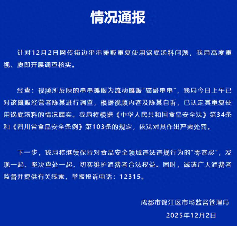 经查:视频所反映的串串摊贩为流动摊贩“猫哥串串”,我局今日上午已对该摊贩经营者陈某进行调查,根据视频内容及陈某自诉,已认定其重复使用锅底汤料的情况属实。我局将根据《中华人民共和国食品安全法》第34条和《四川省食品安全条例》第103条的规定,依法对其作出严肃处罚。
