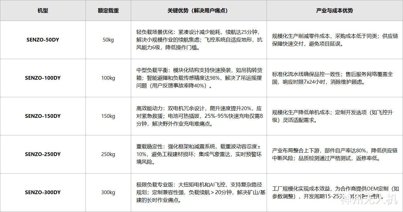 · 垂直整合的完善供应链:核心部件(电机、电调、高强度碳纤维)的自研或深度合作,保障供应稳定与成本最优,直接让利合作商,降低采购与维护成本。