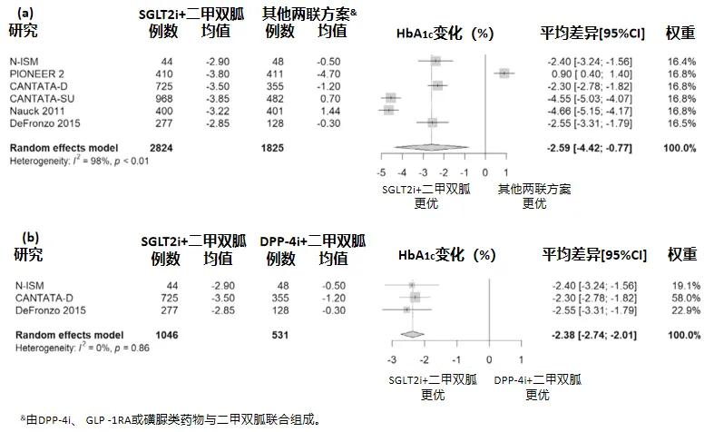 图2. 与其他两联方案(a)、DPP-4i+二甲双胍(b)比较,52周的体重变化