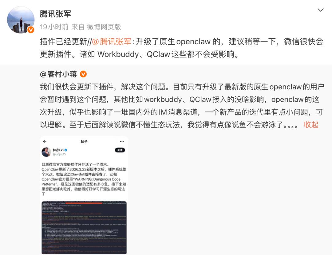 对此,微信员工 @客村小蒋回应,“openclaw 的这次升级,似乎也影响了一堆国内外的 IM 消息渠道,一个新产品的迭代里有点小问题,可以理解”。根据腾讯腾讯公关总监张军的说法,目前微信 Clawbot 插件已完成更新并修复相关问题。