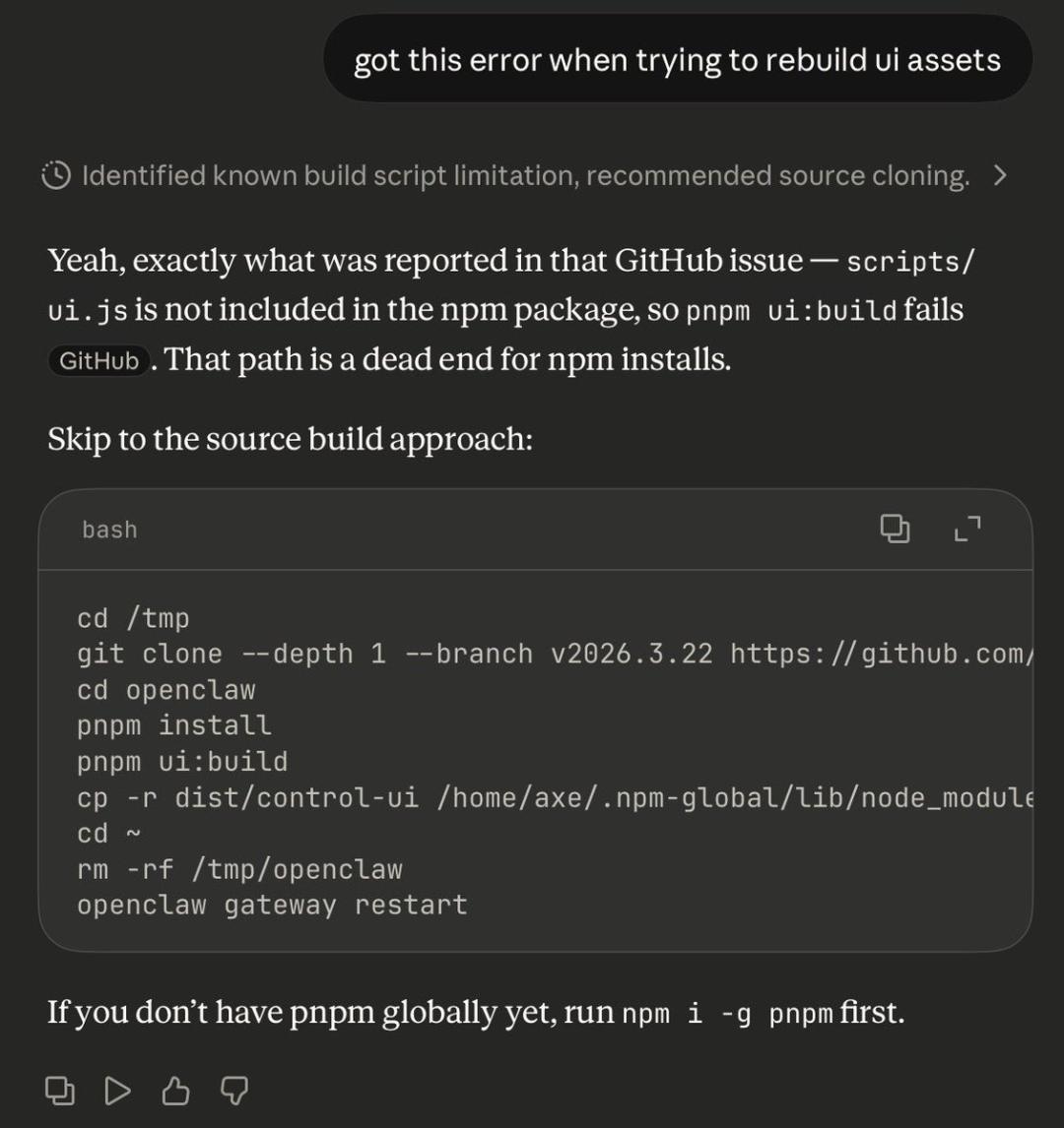 OpenClaw 创始人 Peter Steinberger 随后回应称,这次问题的一个直接原因,是发布流程中漏掉了与 web control UI 资源相关的步骤,导致当前版本无法正确加载对应内容。他建议用户先升级到已经修复的 beta 版,或者等待后续修复后的正式版本。