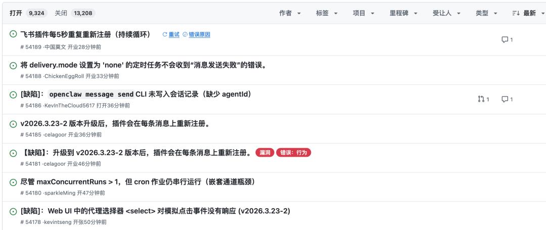 但问题显然不止这一处。国内模型如 MiniMax 配置失效、Windows 沙箱环境中权限报错,而使用了官方插件的微信、飞书、企业微信等也遇到了“更新即崩”的问题。