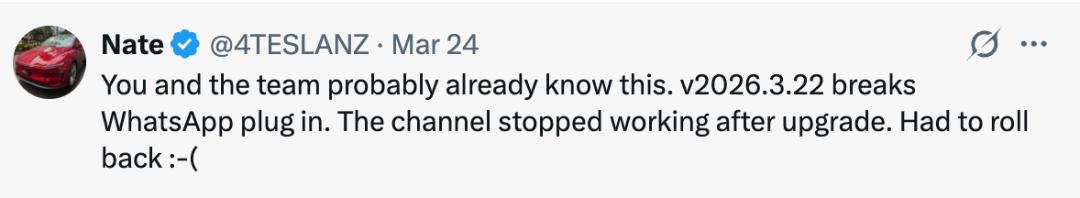 更新后,不少开发者遇到了问题,包括缺失 “dist/control-ui” 目录、系统崩溃。有用户表示,自己的 WhatsApp 插件在更新后直接失效,不得不回滚到旧版本,才能维持服务。