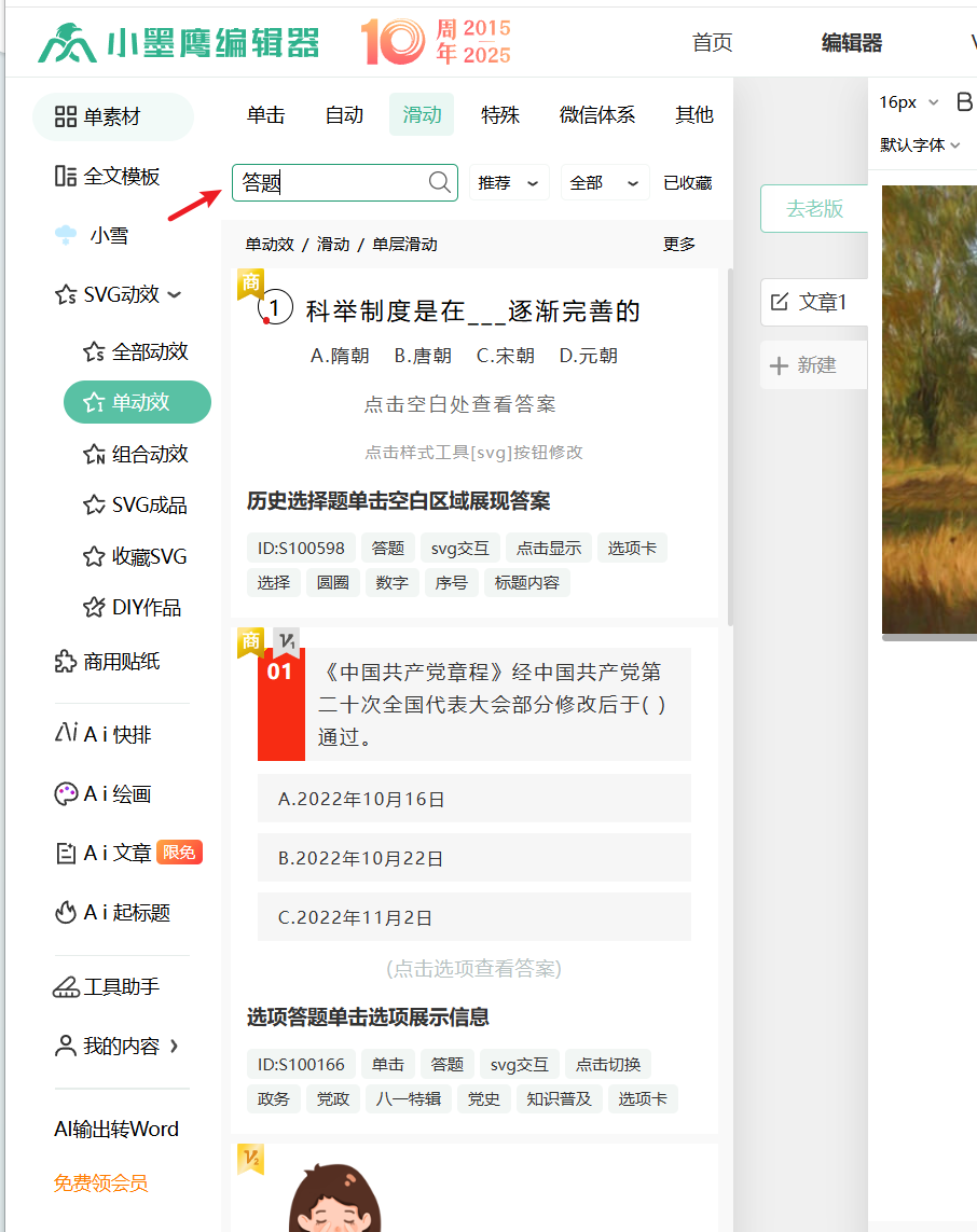 打开小墨鹰编辑器,点击svg按钮,搜索关键词【题目】、【答题】等,会出现很多点击题目出答案的svg,还有点击空白处出答案,支持单选多选题目。可以仔细找一下,总有适合的...