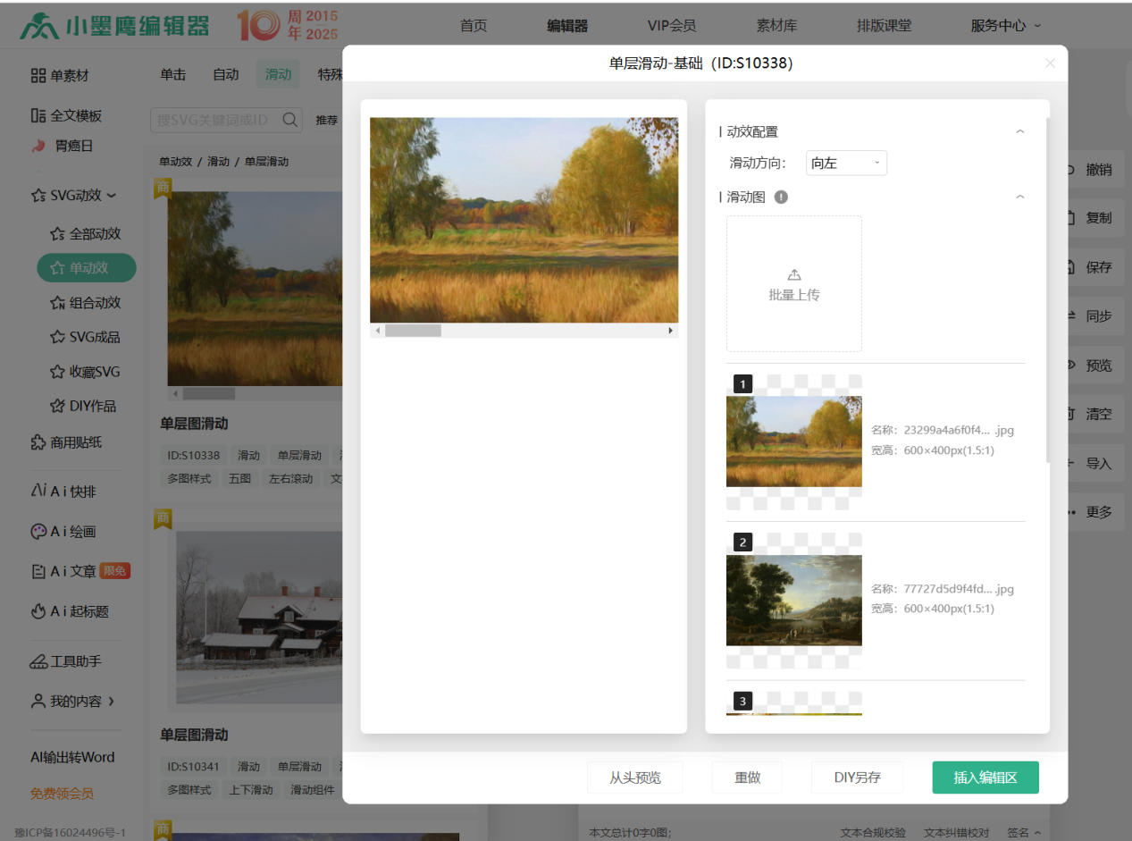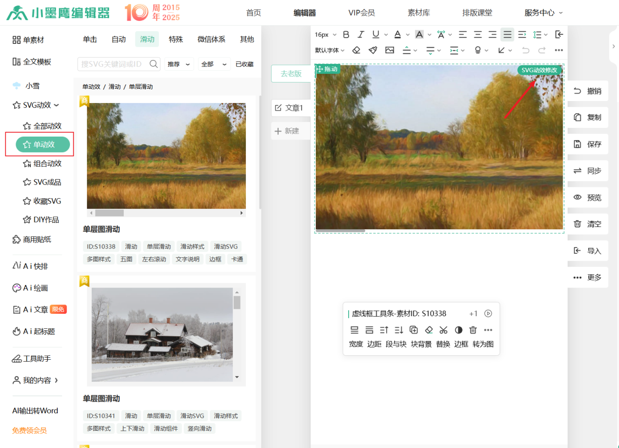 通常实现的方式有两种,方法一编写svg代码实现,这个通常需要有专业的技术工程师。第二种方式借助svg编辑器,也就是有svg样式的公众号排版工具,这里首推小墨鹰编辑器,业内比较知名,svg功能上手也是最简单的,只要点击按钮更换内容就行了。