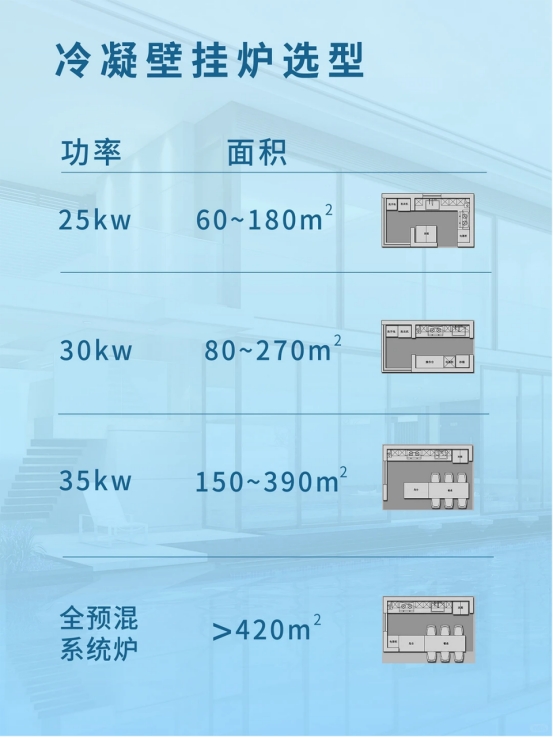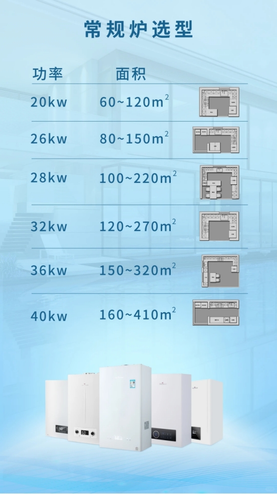 壁挂炉按照实际供暖面积选择对应功率就足够了,功率配得准,家庭供暖系统运行起来才经济高效,详细功率选择可参考下图: