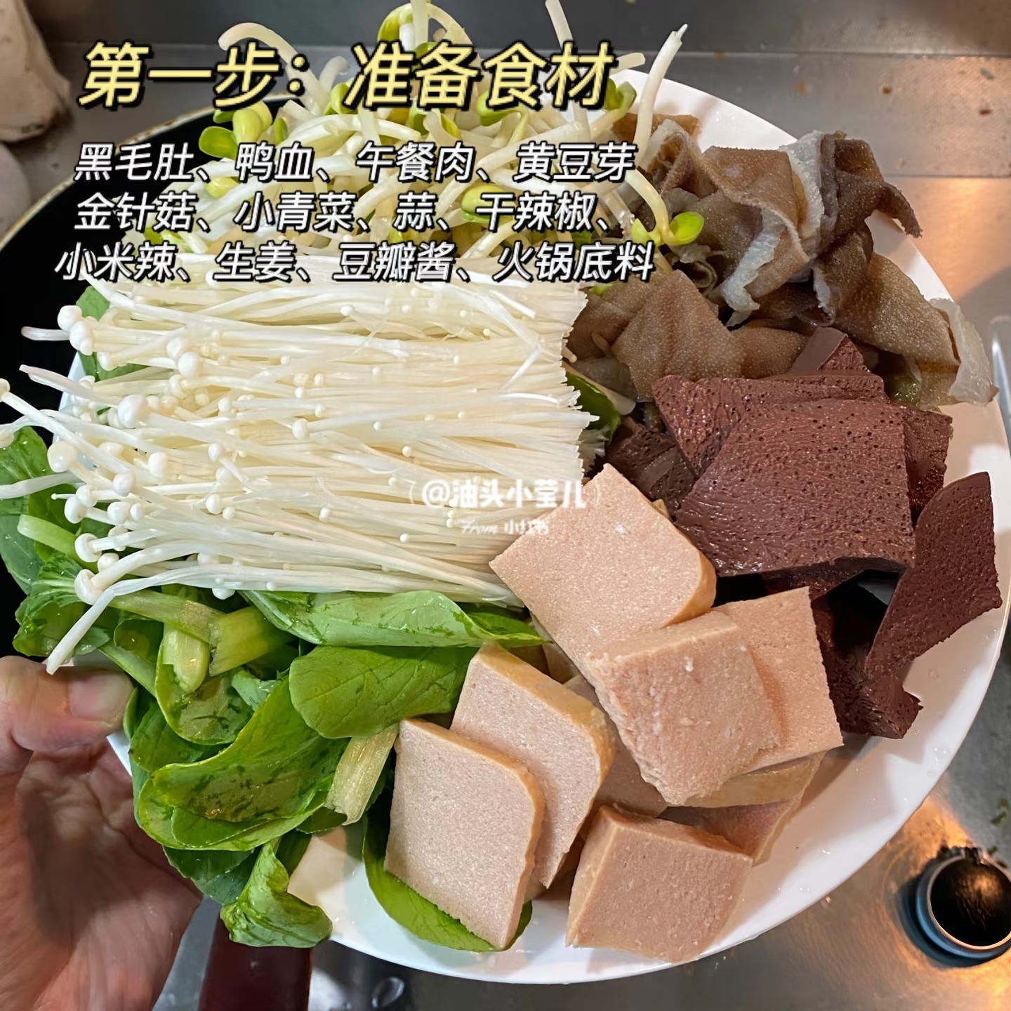 * 主料:鸭血(切厚片)、毛肚(切丝/片)、黄喉、午餐肉(切片)。