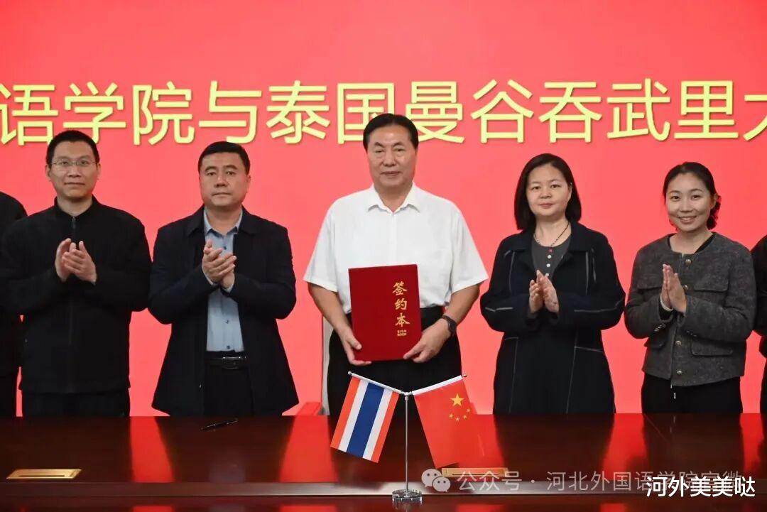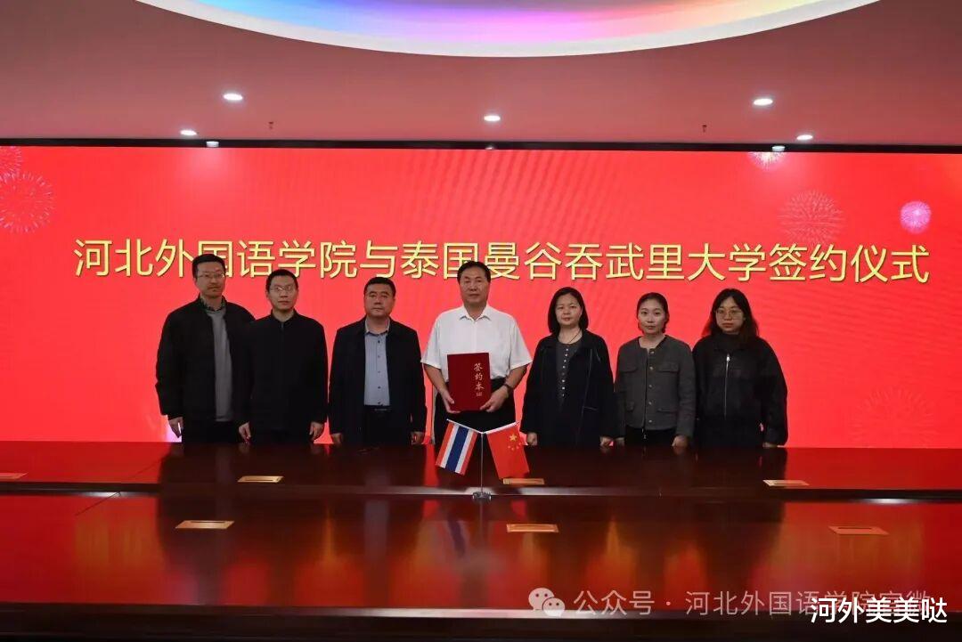 2026年3月27日,河北外国语学院与泰国曼谷吞武里大学隆重举行合作签约仪式。学校董事长、校长孙建忠院士在合作协议书上正式签字盖章,副校长陈伟、国际语言教育学院院长吴艳丽、外事负责人张嘉仪、泰语负责人刘爽等领导、老师共同见证此次签约。