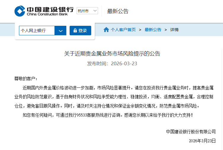 中国建设银行:提示投资者提高贵金属业务的风险防范意识,基于自身财务状况和风险承受能力理性、稳健投资,均衡、适度配置贵金属,合理控制仓位,避免盲目跟风操作。同时,请及时关注持仓情况和保证金余额变化情况,防范贵金属市场风险。